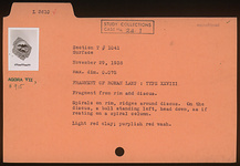 | Description: | Fragment from rim and discus. Spirals on rim, ridges around discus. On the discus, a bull standing left, head down, as if resting on a spiral column. Purplish-red wash. Light red clay. Type XXVIII of Corinth collection. | |