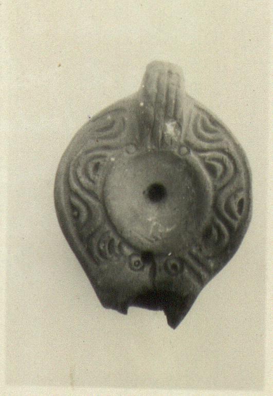 | Description: | On rim, wavy lines. Plain discus, with central filling hole. Handle solid, triple grooved above, double below; two impressed circles at junction with discus. On bottom, double almond-shaped grooves, within which six impressed circles. Unglazed. Pinkish-buff clay. Type XΧVIII of Corinth collection. ADDENDA For nozzle cf. Corinth IV, ii, p. 105, fig. 49, no. 3. Cf. Corinth IV, ii, no. 800, pl. XIII. | |