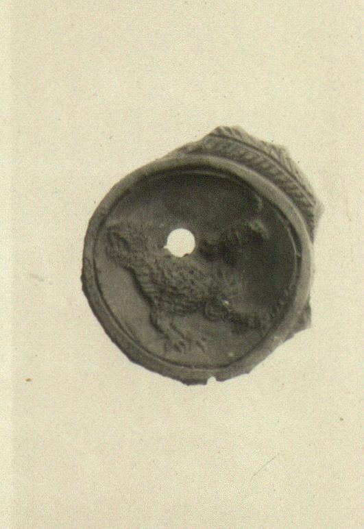 | Description: | Discus with bit of rim. On rim, herringbone. Discus, concave; a large cock occupies nearly half of the discus, his head bent down to peck at the nose of a lizard at the edge of the discus. In the field above the cock's head, a small animal, dog (?). Above the cock's back a filling hole. Animals rendered in gouged technique similar to that used on bears, etc. in type XXVIII of Corinth collection, but fabric seems finer, and discus much more concave. Unglazed. Fine, micaceous, pinkish-buff clay. Type XΧVIII (?) of Corinth collection. | |