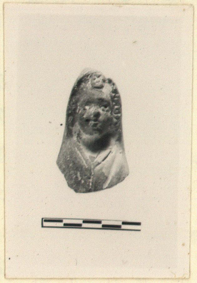 | Description: | The head and the upper part of the front of a hooded draped figure, probably a girl; part of a plastic lamp such as L 3459. Red clay with thin pinkish surface; right side much burned and peeled. | |
