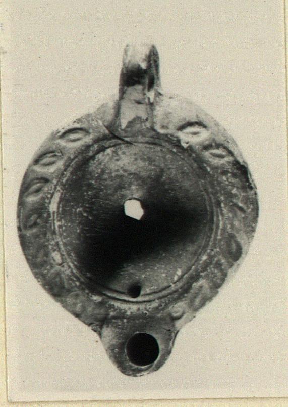 Impressed petals on rim. Small rounded nozzle. Thin high-pierced handle; two grooves on its top. Circular reverse enclosed by a single groove; two small impressed circles at base of handle.