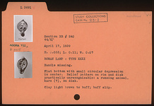 | Description: | Handle missing. Flat bottom with small circular depression in center. Relief pattern on rim and disk practically unrecognizable: a running animal, hare (?), on disc. Clay light brown to buff; buff slip. Type XXXI of Corinth collection. | |