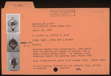 | Description: | Intact. Grooved handle with finger hole. Rim plain save for groove at throat of nozzle, and a small circle either side. On discus, cock, standing right; two grooves just within rim. Thin brownish-red glaze over creamy slip. On the bottom, incised in the unbaked clay, within a circular groove. Brown clay. Type XXV of Corinth collection. <graphic> | |