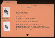 | Description: | About half of disk and handle preserved. Jewelled maltese cross on disc; interlocking S-curved lines on rim. Large pointed knob handle. Red-brown clay, much blackened. Type XXXI of Corinth collection. | |