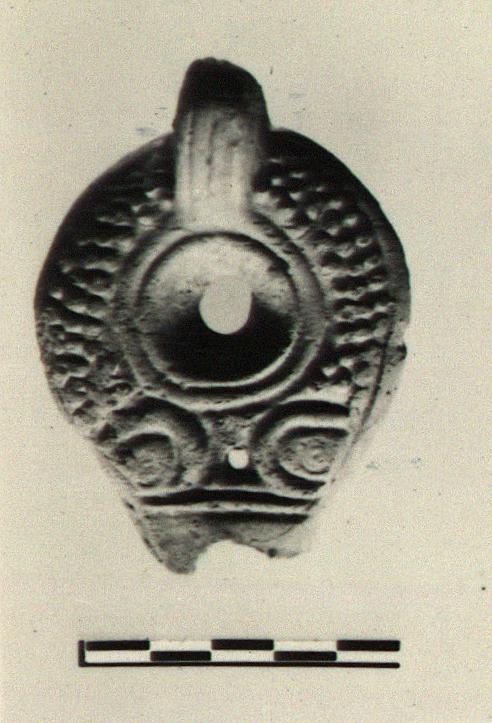 | Description: | Single fragment preserves most of upper half of lamp. End of nozzle broken away. Discus, plain. On rim, raised dots, volute at nozzle. Handle, unpierced, three grooves above, two below. Unglazed. Buff clay. Type XXVIII of Corinth collection. | |