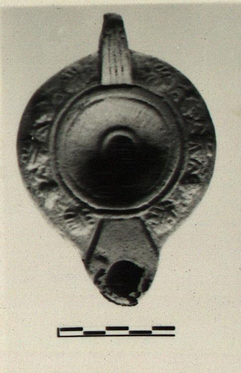 | Description: | Intact. Vine pattern at rim, with grooves around inner edge; rays (worn) on discus. Handle, unpierced, triple grooved in front, single behind. On reverse, two concentric circular grooves. Sandy buff clay. Type XXVII of Corinth collection. | |