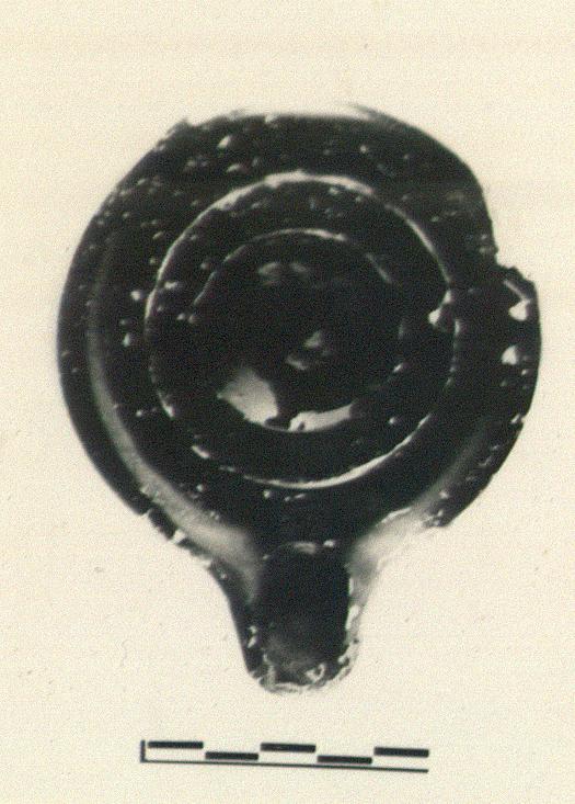 | Description: | Complete but chipped at one side. Shallow rounded body; raised band around central opening; rather long nozzle. Black glaze, somewhat chipped on top, nozzle, and inside. Dilute glaze wash outside. Type V of Corinth collection, type 20 of Agora collection. | |