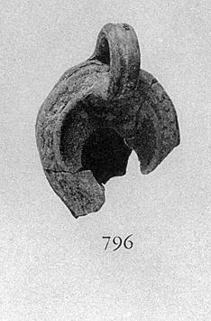 | Description: | Nozzle and part of the right side missing. Down sloping rim with raised dots; discus nearly flat. High grooved handle. Low raised base with the letter "alpha" in relief. Thin red glaze wash. Light red clay. Type XVIII variant of Corinth collection, type 55C of Agora collection. | |
