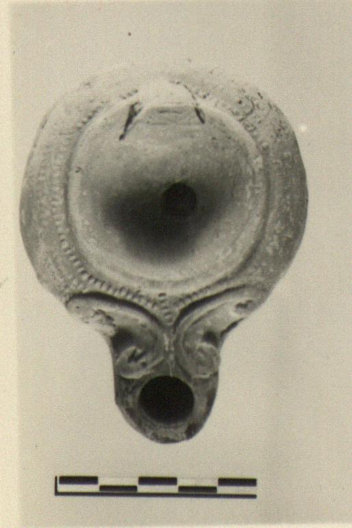 | Description: | Handle missing. Raised dots are smaller than usual in lamps of this type, and are arranged in lines. Red, partially peeled glaze. On bottom the usual "alpha". Orange-buff clay. Type XX of Corinth collection. | |
