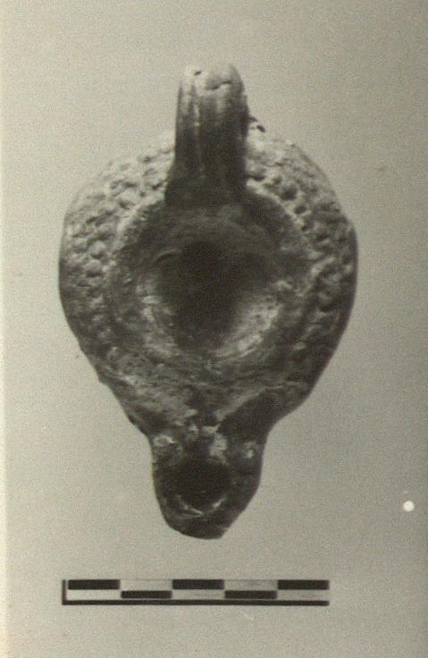 | Description: | Intact. Typical globules on top and lower body; typical raised "alpha" on reverse. Poor red to gray glaze wash. Type XX of Corinth collection. | |