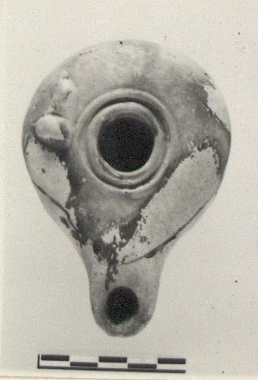 | Description: | Fragments of lower body missing. Lug on top at left; two ridges around filling hole; raised base, concave beneath. Greenish-black glaze, much worn. Type IX of Corinth collection, type 43A of Agora collection. | |