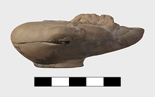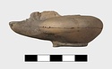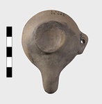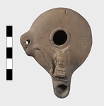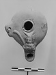 | Description: | Complete save minor chips. Ordinary watch-shaped type, the top rather flat; a groove and ridge around the filling hole; raised base, roughly made. Pierced knob on left; in high relief between filling hole and nozzle, a head of Pan playing the pipes. Unglazed. Grayish clay. Type IX of Corinth collection, Miscelaneous Moulded type of Agora collection. | |