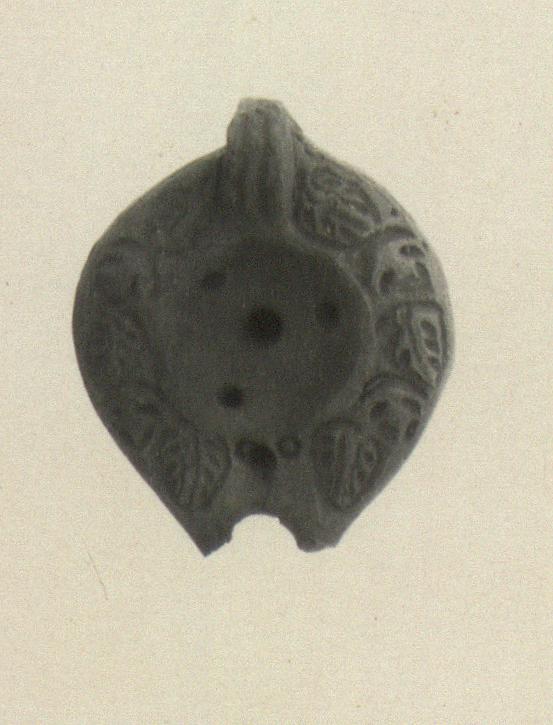 | Description: | End of nozzle broken away. On rim, incised vine pattern in crude technique; two stamped circles and an air hole at junction of nozzle and discus. Plain discus, with one central and three auxillary oil holes. Handle solid, double grooved. Bottom, double grooved, almond-shaped; five stamped circles within, in cross formation. Two others at base of handle. Unglazed. Grayish-brown clay. Type XXVIII of Corinth collection. | |