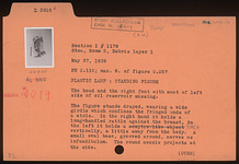 | Description: | The head and the right foot with most of left side of oil reservoir missing. The figure stands draped, wearing a wide girdle which confines the fringed ends of a stole. In the right hand it holds a long-handled rattle against the breast, in the left it holds a torch vertically, a little away from the body. A small oval base, grooved around, serves as infundibulum. The round nozzle projects at the side. Thin glaze, red wash inside reservoir. Buff clay. | |