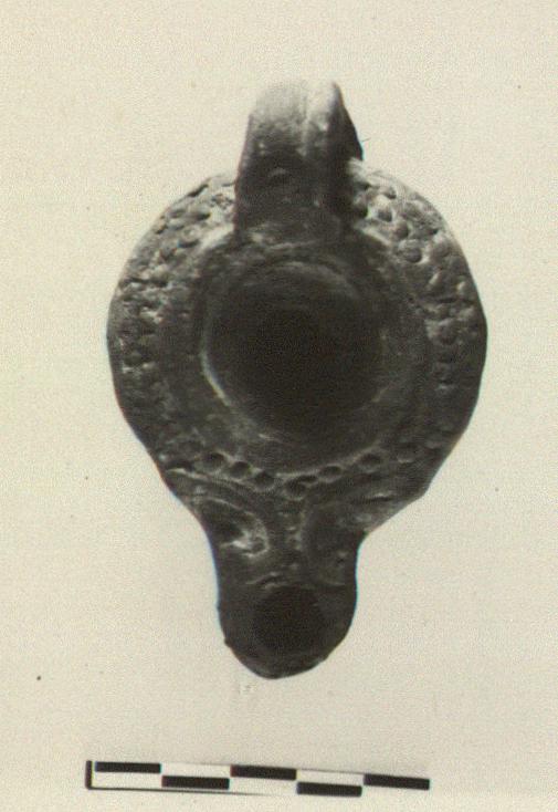 | Description: | Intact. A rather small lamp, with the two halves roughly smeared together and the band handle, low, thick and carelessly grooved. Typical globules and "alpha". Red clay and glaze. Type XX of Corinth collection. | |