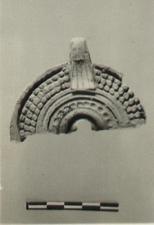 | Description: | Back half with handle. Raised globules on rim, for a ring around upper edge of depressed discus, and on lower part of body. Handle pierced; triple grooved above, double behind. Pink to buff clay; light buff surface. Type XXVII variant of Corinth collection. | |