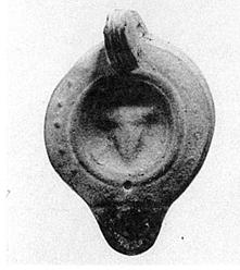 | Description: | Intact. On discus, boukranion; on rim, raised dots; handle unpierced, triply grooved on top, doubly grooved on bottom. On reverse, concentric ridges. No glaze. Light brown clay. Type XXVIII of Corinth collection. | |