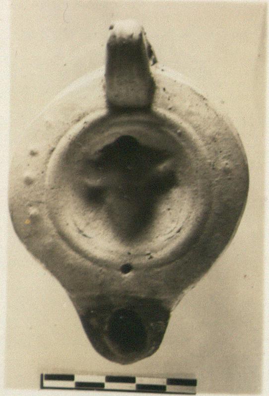 | Description: | Intact. On discus, boukranion; on rim, raised dots; handle unpierced, triply grooved on top, doubly grooved on bottom. On reverse, concentric ridges. No glaze. Light brown clay. Type XXVIII of Corinth collection. | |