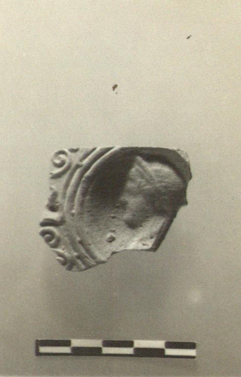 | Description: | Fragment of rim with spirals, and of discus with head, left, wearing diadem. Unglazed. Pinkish-buff clay. Type XXVII of Corinth collection. | |