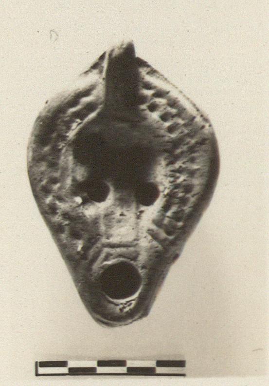 | Description: | Intact. Cross on discus, its base extending into broad channel to nozzle. Debased herringbone on rim. Small solid handle, double grooved in front, single behind. On reverse, double almond-shaped grooves punctuated by small circles and enclosing a palm branch. Unglazed. Pink to buff clay. Type XXVIII of Corinth collection. | |