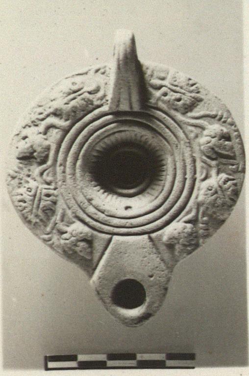 Rays and rings on discus; vine leaves and grapes on rim; handle double grooved and pierced; low ring base.