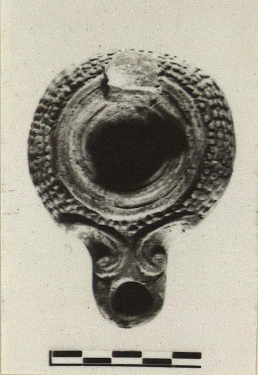 | Description: | Handle missing. Rather broad high ridge around discus; typical globules and "alpha". Worn red to dark brown glaze. Light red clay. Type XX of Corinth collection. | |