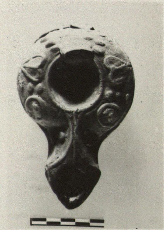 | Description: | Complete except for handle. Large lamp with hearts and shields, separated by groups of dots, on upper body. Broad triangular nozzle. On the reverse, in relief, "alpha" within two concentric ridges. Dull light red wash. Red clay with buff surface. Type XVIII of Corinth collection, type 50C of Agora collection. | |