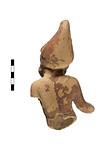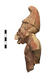 | Description: | Preserved from waist up, right hand, left arm and end of nose missing. Male figure, nude except for strap over right shoulder, and high stocking cap with end turned forward. Pierced eyes, large flat nose, open mouth with tongue stuck out. Traces of blue paint above left eyebow (?). Dull red wash. Slightly micaceous yellow-buff clay. | |