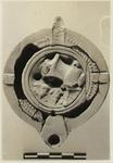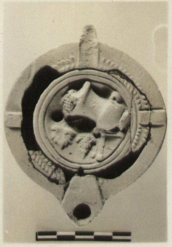 | Description: | Top of handle and few pieces between disk and rim missing. On panelled rim, wreath of small pointed leaves at inner edge; on disc, a large krater tipped on its side on a table, grapes falling from krater, grapes and grape-leaf below. Handle double grooved below; a vine-leaf at its base, within two circular grooves. Incised on bottom. Unglazed. Reddish-buff clay. Type XXVII of Corinth collection. | |