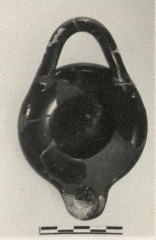 | Description: | Parts of rim missing; restored in plaster. Low broad base, flat but slightly concave beneath. Wall and rim form continuous curve; rim wider than L 3971 (ΓΓ 705). Nozzle short and blunt. Horizontal strap-handle rising above level of rim. Good black glaze slightly chipped; base reserved. Type IV of Corinth collection, type 21B of Agora collection. | |