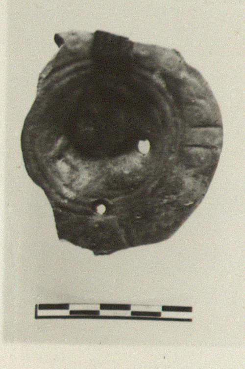 | Description: | A single fragment preserves most of top. On discus, head of Mithras, left. On rim, reversing spirals. Handle mostly broken, three grooves above. Glaze dull purplish-brown. Buff clay. Type XXVIII of Corinth collection. | |