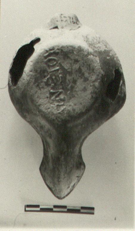 | Description: | Handle missing; chips from side. Watch-shaped body, small discus, top rayed. Long nozzle, triangular at end. Rudimentary unpierced knob at right. Vertical strap-handle. Signed: "ΑΙΝΕΙΟΥ"; letters in relief, incised in the mould. Dull glaze fired red, much peeled. Considerable traces of burning at end of nozzle. Reddish-buff clay. Type XVIII of Corinth collection, type 52C of Agora collection. | |