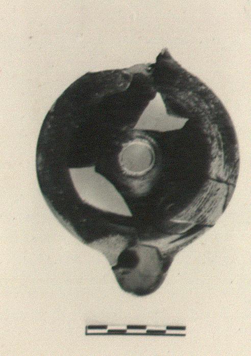 Broad shallow lamp with large central cone and two spoon-shaped nozzles, opposite each other. No base. The rim, sloping gently down and in, does not project outside.