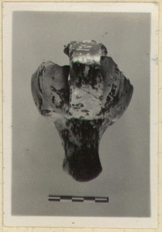 | Description: | Back half of body missing. Concave top with high-swung basket-handle over it. Double-convex body. Long nozzle, fluked. Unpierced knob at side. Very flaky black glaze. Type XII of Corinth collection, type 35B of Agora collection. | |
