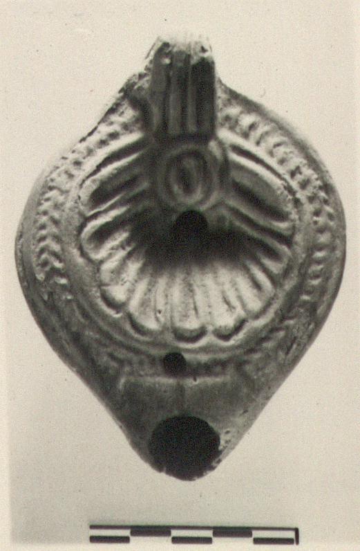 | Description: | Intact. Discus with shell; rim with herringbone. Handle, unpierced, three grooves above, two below. Reverse: within two grooves, "T". Glaze, thin, purplish. Type XXVIII of Corinth collection. | |