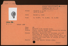 | Description: | Vertical handle broken away. Body covered with raised dots. Discus plain, rather deep; surrounded by triple groove and raised edge. Nozzle rounded, decorated in volutes; set off from body by raised band and row of raised dots, largely worn away. Start of another row from base of nozzle up central ridge. Bottom slightly raised, rising; grooved within edge. No trace of signature remains. Purplish-brown glaze. Hard brownish clay. Type XX of Corinth collection. | |