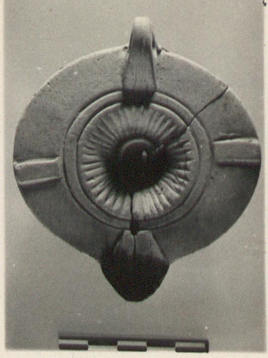 | Description: | Fragments of discus and body missing. Discus with rays; rim plain with panels. Handle pierced; three grooves above, two below. Reverse: slightly raised ring. No glaze. Buff clay. Type XXVII of Corinth collection. | |