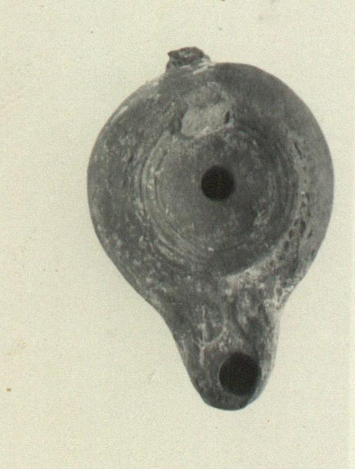 | Description: | Vertical handle broken away. Body covered with raised dots. Discus plain, rather deep; surrounded by triple groove and raised edge. Nozzle rounded, decorated in volutes; set off from body by raised band and row of raised dots, largely worn away. Start of another row from base of nozzle up central ridge. Bottom slightly raised, rising; grooved within edge. No trace of signature remains. Purplish-brown glaze. Hard brownish clay. Type XX of Corinth collection. | |