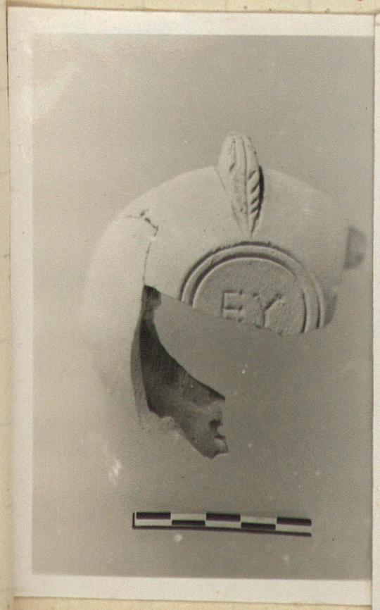 | Description: | Nozzle, top of handle, much of discus and body missing. Discus (as preserved, edge only) plain. Rim with raised dots and panel with ladder. Handle with three grooves above, two below; herringbone on lower part. Reverse: incised signature within two grooves: "EY". Unglazed. Fragmentary. Grayish-buff clay. Type XXVIII of Corinth collection. ADDENDA Three other fragments with same signature stored with pottery from same well. | |