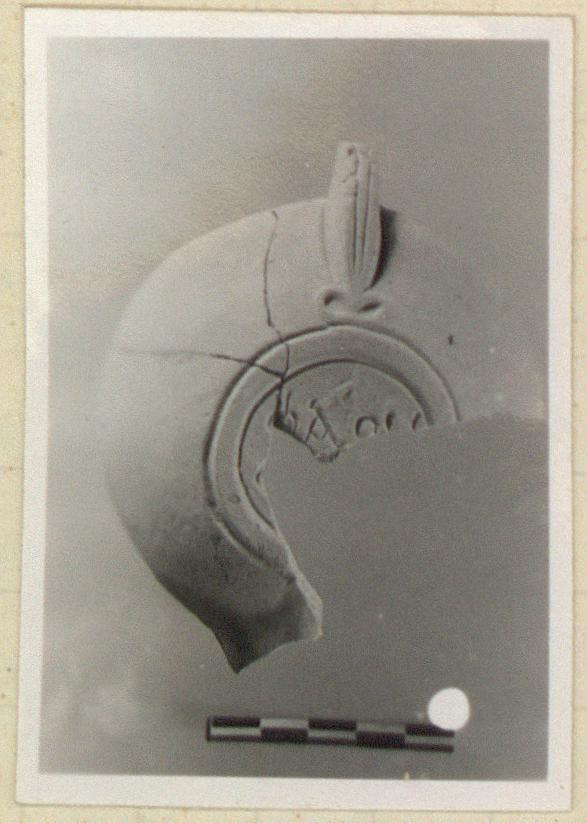 | Description: | Most of nozzle and top, some of body and bottom missing. Rim with herringbone. Handle, pierced, two grooves, ivy leaf at base. Reverse: within two grooves, the signature, incised except for letter at top which is raised. Unglazed. Fragmentary. Buff clay. Type XXVIII of Corinth collection. <graphic> | |