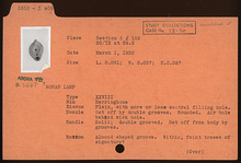 | Description: | On rim, herringbone. Discus plain, with more or less central filling hole. Nozzle, set off by double grooves. Rounded. Air hole behind wick hole. Handle solid; double grooved; set off from body by grooves. On bottom, almond-shaped groove. Within, faint traces of signature (?). Light slip (?). Coarse pink clay; surface peeling. Type XXVIII of Corinth collection. | |