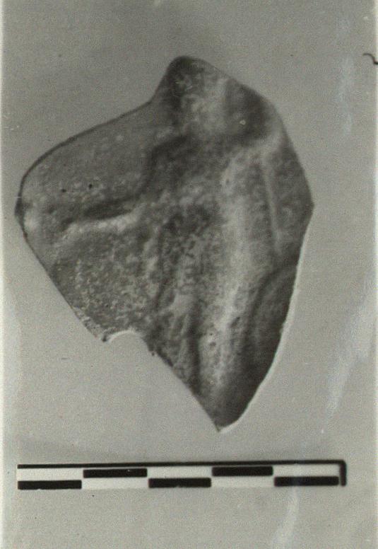 | Description: | Single fragment from discus. A standing draped figure in relief; a spear resting on a wheel (?) in upraised left hand; a flat object in outstretched right hand. Dull red glaze, somewhat flaked. | |