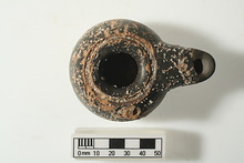 | Description: | End of nozzle missing. No handle; pierced lug on one side; deep groove around rim; low base. Black glaze, somewhat peeled. Type VIIa of Corinth collection, type 25B of Agora collection. Cf. Hesperia Suppl. 8 (1949), p. 99. | |