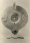| Description: | Fragment of body missing; otherwise intact. Rim, raised dots with volutes at center of either side. Discus, rays; handle, pierced, three grooves above and below. Reverse, double groove; uninscribed. Unglazed. Buff clay. Type XXVII of Corinth collection. | |