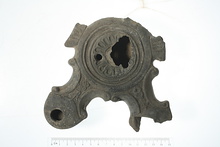 | Description: | Back part of body with handle, chips from discus and the end of one nozzle missing. Flat bottom; two nozzles with volutes at their bases. Relief petals on discus and grooves around it. Black glaze overall. Gray clay. Type XXI of Corinth collection. | |
