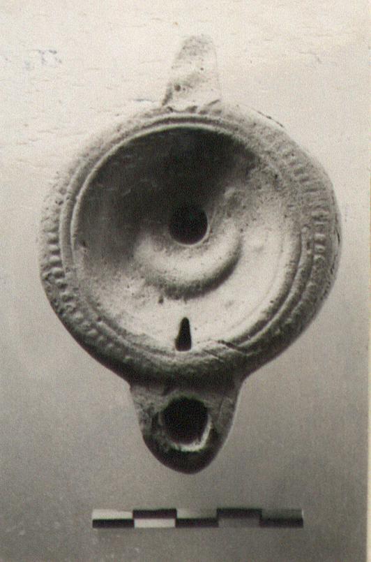 | Description: | Top of handle missing; otherwise complete. Discus, crescent moon within circle of dots. Rim grooves and row of raised dots. Reverse, grooves. Unglazed. Buff clay. Type XXVII Variant of Corinth collection. | |