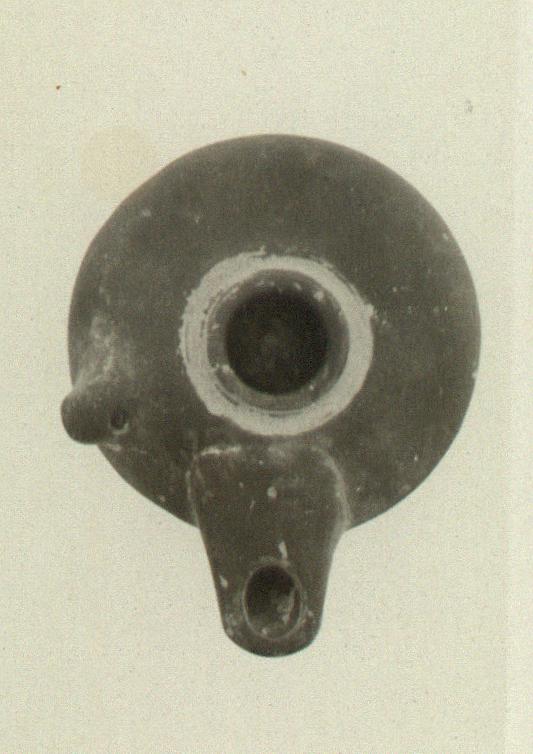 | Description: | Flattened double convex body, sharp angle around center. On top, filling hole 0.016m. in diameter, surrounded by narrow rim, set off from body by groove of the same width. Nozzle slightly uptilted. Pared top, not quite flat. Perforated knob on left side. Raised base, rising in two stages. Thick inside. Solid but slightly iridescent black glaze inside and out save under side of base. Groove has lost most of its glaze. Attic clay. Type IX of Corinth collection, type 29A of Agora collection. ADDENDA Not found from January 1938. | |