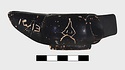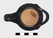 | Description: | Intact except for horizontal strap handle at back missing. Raised base, slightly concave beneath. Scraped groove around narrow rim. Inscribed on one side and on the other, upside down to the lamp, and on the top of the nozzle. Good black glaze over all, except resting surface. Type VIIA of Corinth collection, type 25A of Agora collection. <graphic> | |