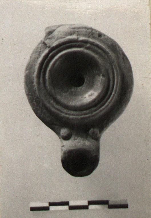 | Description: | Complete except for vertical handle. Small squat lamp, the plain rim separated from the plain concave discus by three ridges. Two raised dots at throat of nozzle; end of nozzle raised: slightly higher than top of lamp. Reverse, neatly grooved base ring with small groove around center inside. Good red glaze, somewhat peeled. Light red clay. First half of 2nd. century. | |