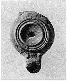 | Description: | Complete except for vertical handle. Small squat lamp, the plain rim separated from the plain concave discus by three ridges. Two raised dots at throat of nozzle; end of nozzle raised: slightly higher than top of lamp. Reverse, neatly grooved base ring with small groove around center inside. Good red glaze, somewhat peeled. Light red clay. First half of 2nd. century. | |